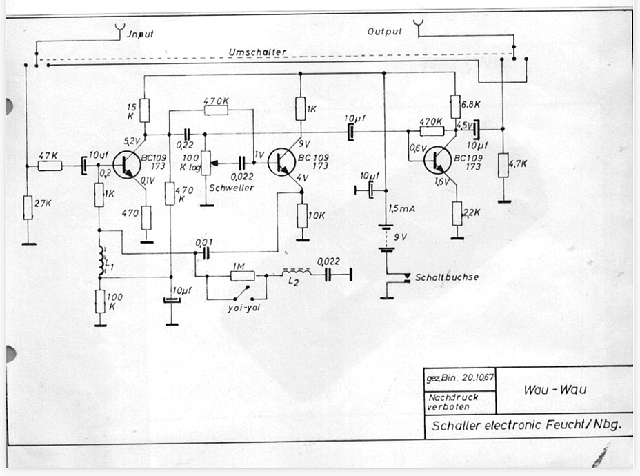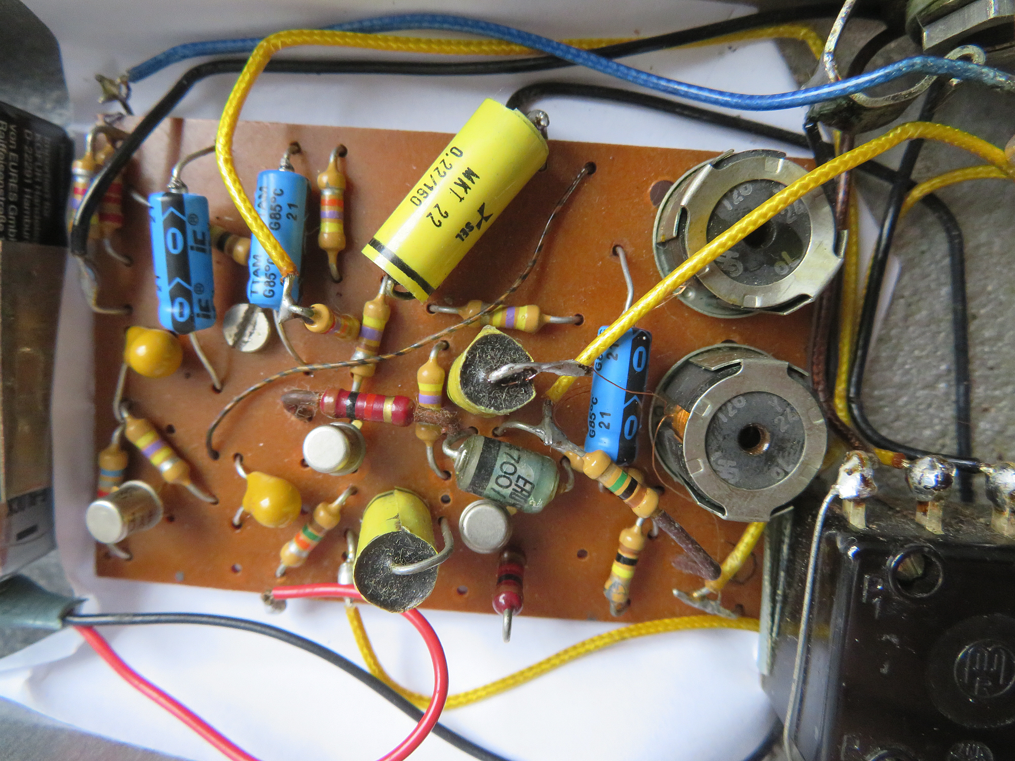 Many thanks go out to my good friend Holger, a local guitarist, who also happens to own such a pedal. He provided several pictures so I was able to check all the connections. He also had a copy of the schematics from Oct 1967. My unit seems to be even older than that, because it came withodd vintage tantalum capacitors whose colour code verified the measured unusual value of 13µF, which cannot be found in the schematics. I replaced these with 15µF capacitors and I also swapped the old 10µF electrolytic capacitors.